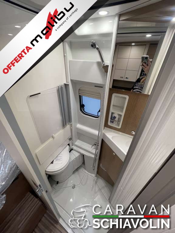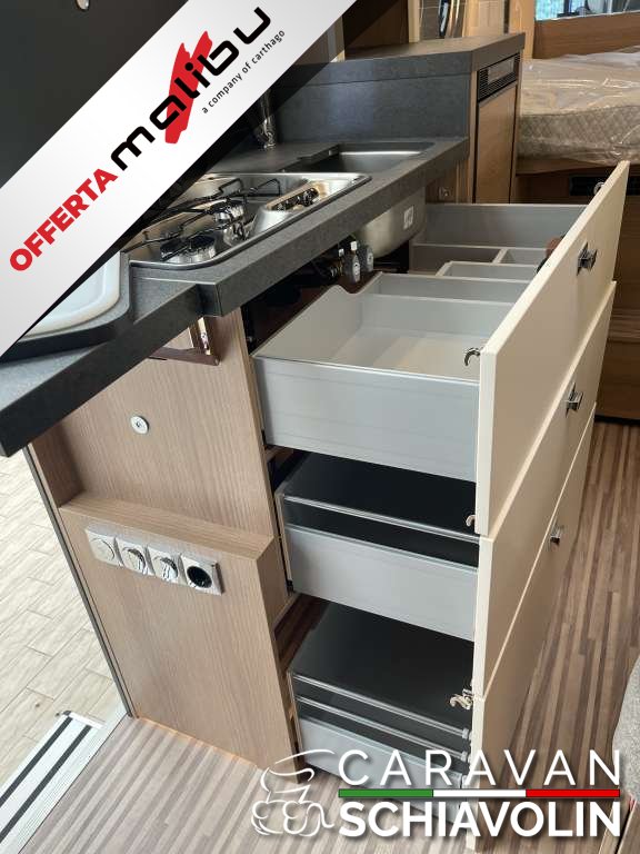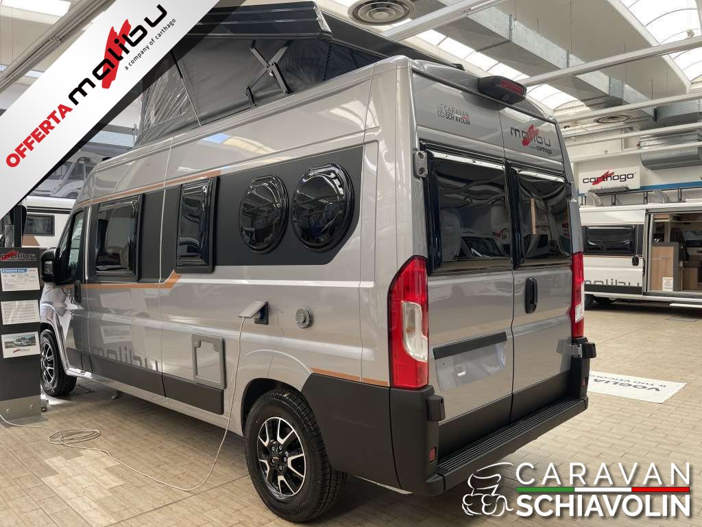 CAMPER VAN DI FASCIA PREMIUM MALIBU BY CARTHAGO CON GRANDE SPAZIO INTERNO, TETTO A SOFFIETTO IBRIDO, ECCELLENTE COIBENTAZIONE, AMPI SPAZI DI STIVAGGIO E GRANDE BAGNO CON WC A SCOMPARSA.