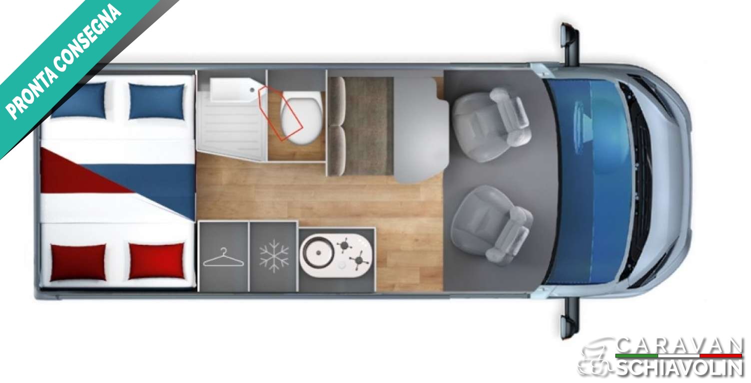 CAMPER PURO VAN DA 5,99 MT CON 4 POSTI LETTO SEMPRE PRONTI, AMPIO BAGNO CON LAVANDINO TRASLABILE, FRIGORIFERO GRANDE E ARMADIO A TUTTA ALTEZZA CON DOPPIA ANTA E BARRE APPENDIABITI.