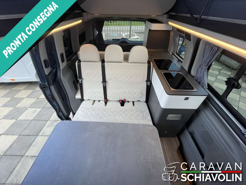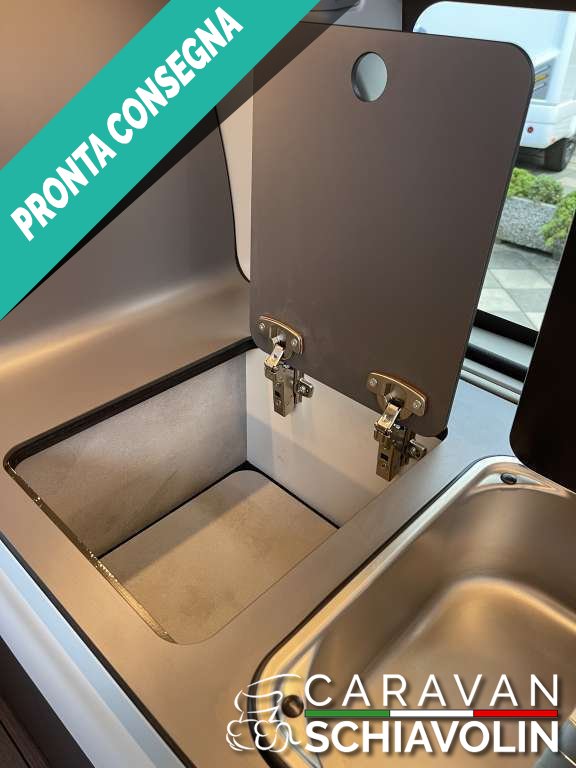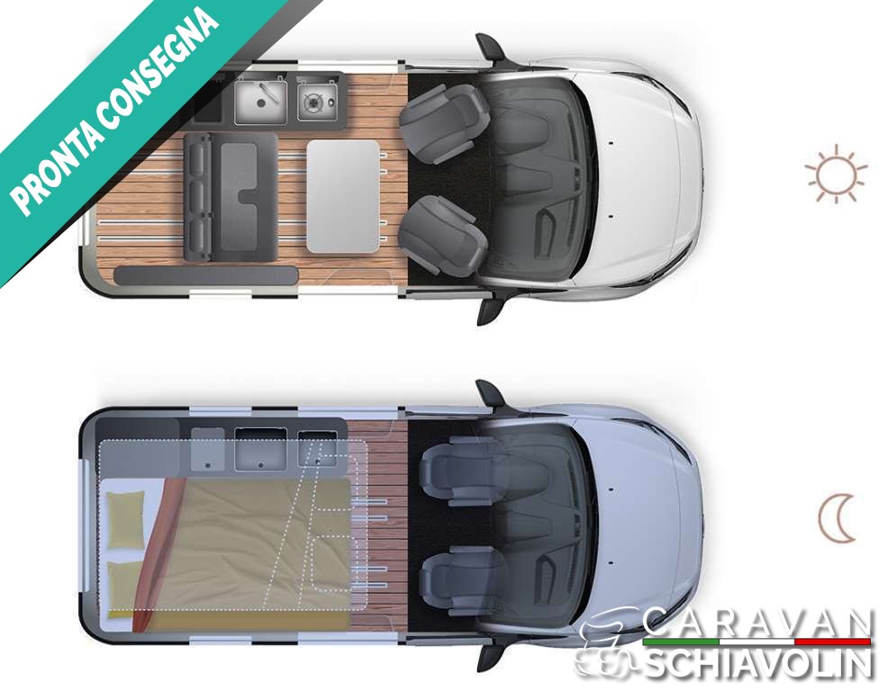 PUNTI DI FORZA = 4 posti letto per adulti + Doppio accesso interno con doppia porta scorrevole + Frigorifero portatile a compressione + Blocco cucina funzionale e accessibile sia dall'interno che dall'esterno del veicolo, Divanetto tre posti scorrevole su binari con sistema di fissaggio Isofix, Telecamera di retromarcia con monitor di controllo integrato al cruscotto