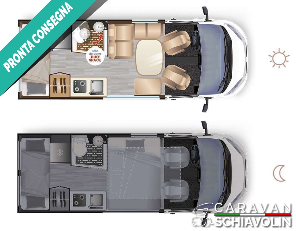 PUNTI DI FORZA = Il furgonato ideale per viaggiare comodamente in famiglia, 5 posti letto + Bagno DUO'SPACE ottimale, +Doppio pavimento tecnico con vani contenitori + Grande frigorifero 149 L: maggiore autonomia per i viaggi più lunghi + Serbatoio acque grigie riscaldato + Sedile con fissaggio ISOFIX per bambini: sicurezza e comfort per i piccoli viaggiatori + Stivaggio 5° sedile