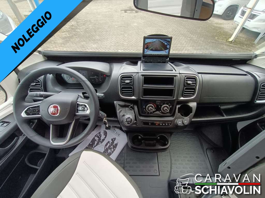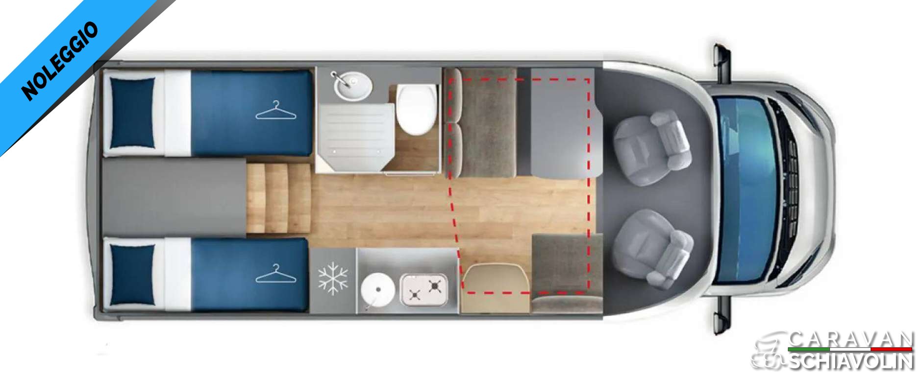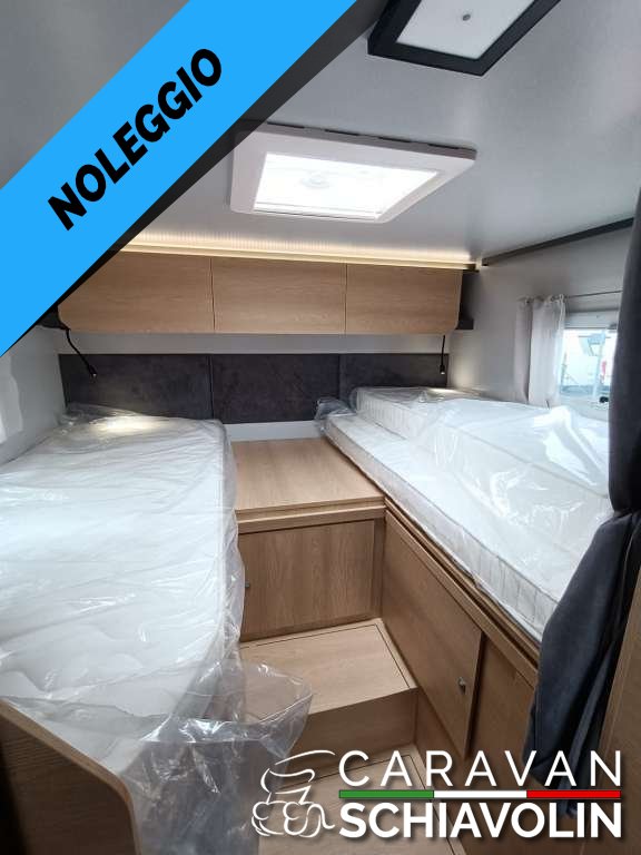 Airbag passeggero, Climatizzatore cabina (automatico Ford), Esp, Traction Plus, Hill holder e Hill descent, Start & Stop, Cruise control, Predisposizione radio con comandi al volante, Volante in pelle, Drl led (Ford), Freno a mano elettrico, Fendinebbia, Paraurti verniciato in tinta, Foderine cabina in tinta, Serbatoio acque grigie riscaldato, Zanzariera porta cellula, Luce esterna a led, Comando Truma CP Plus con pred. I-Net, Rear style con fari a led, Apertura gavoni dx/sx 70x110cm, altezza max interno gavone 118cm, Misure dei letti: letti gemelli posteriori 78x190 / 82x195cm, letto basculante sopra dinette 130/120x196cm, letti dinette 124/54x206cm